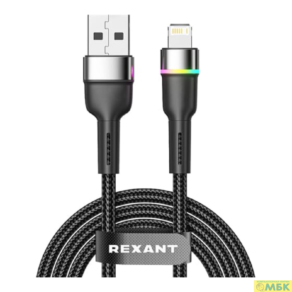 Rexant (18-7059) Кабель USB-A – Lightning для Apple, 2,4А, 1м, в черной нейлоновой оплетке, с LED подсветкой