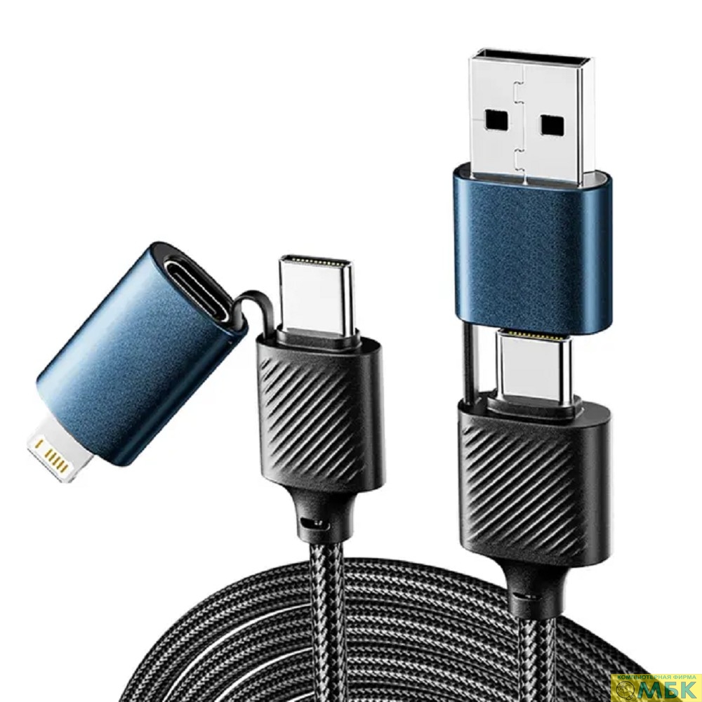 Rexant (18-7094) Кабель 4в1 USB-A, Type-C, Type-C, Lightning 65Вт, 1м, в черной нейлоновой оплетке