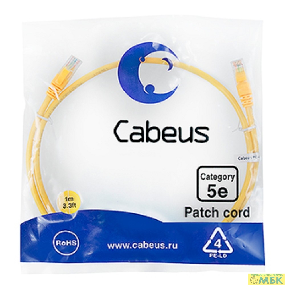 Cabeus PC-UTP-RJ45-Cat.5e-1m-YL Патч-корд U/UTP, категория 5е, 2xRJ45/8p8c, неэкранированный, желтый, PVC, 1м