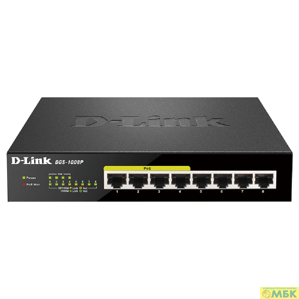 D-Link DGS-1008P/E1A Неуправляемый коммутатор с 8 портами 10/100/1000Base-T (4 порта PoE 802.3af/at, PoE-бюджет 80 Вт)