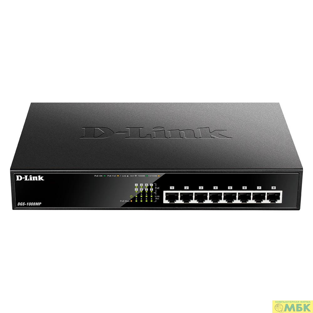 D-Link DGS-1008MP/B1A Неуправляемый коммутатор с 8 портами 10/100/1000Base-T с поддержкой PoE 802.3af/at (PoE-бюджет 125 Вт)
