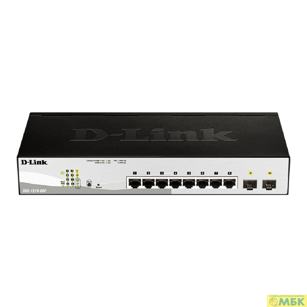 D-Link DGS-1210-08P/G3A Настраиваемый L2 коммутатор с 8 портами 10/100/1000Base-T и 2 портами 1000Base-X SFP (8 портов PoE 802.3af/at, PoE-бюджет 65 Вт)