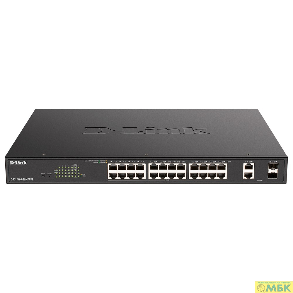 D-Link DGS-1100-26MPV2/A3A Настраиваемый L2 коммутатор с 24 портами 10/100/1000Base-T и 2 комбо-портами 1000Base-T/SFP (24 порта PoE 802.3af/at, PoE-бюджет 370 Вт)