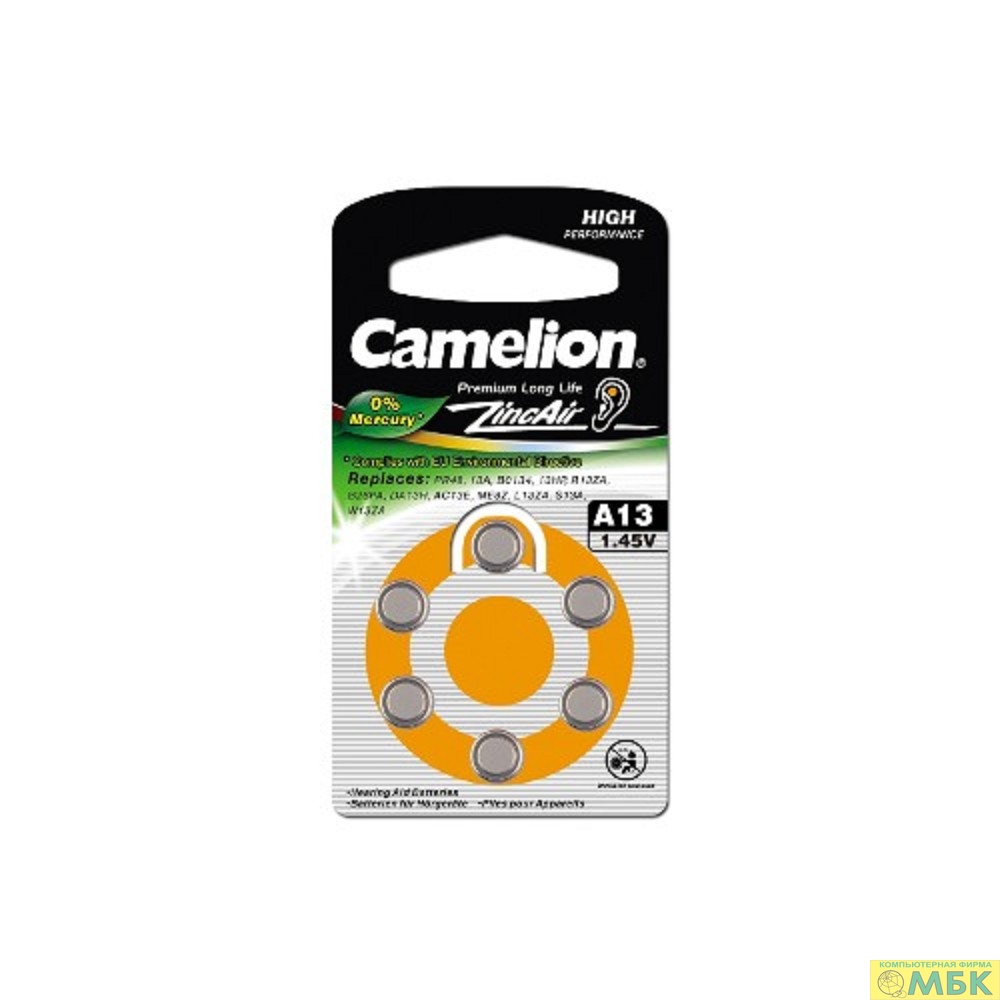 Camelion ZA13 BL-6 Mercury Free (A13-BP6(0%Hg), батарейка для слуховых аппаратов, 1.4 V,280mAh) (6 шт. в уп-ке)