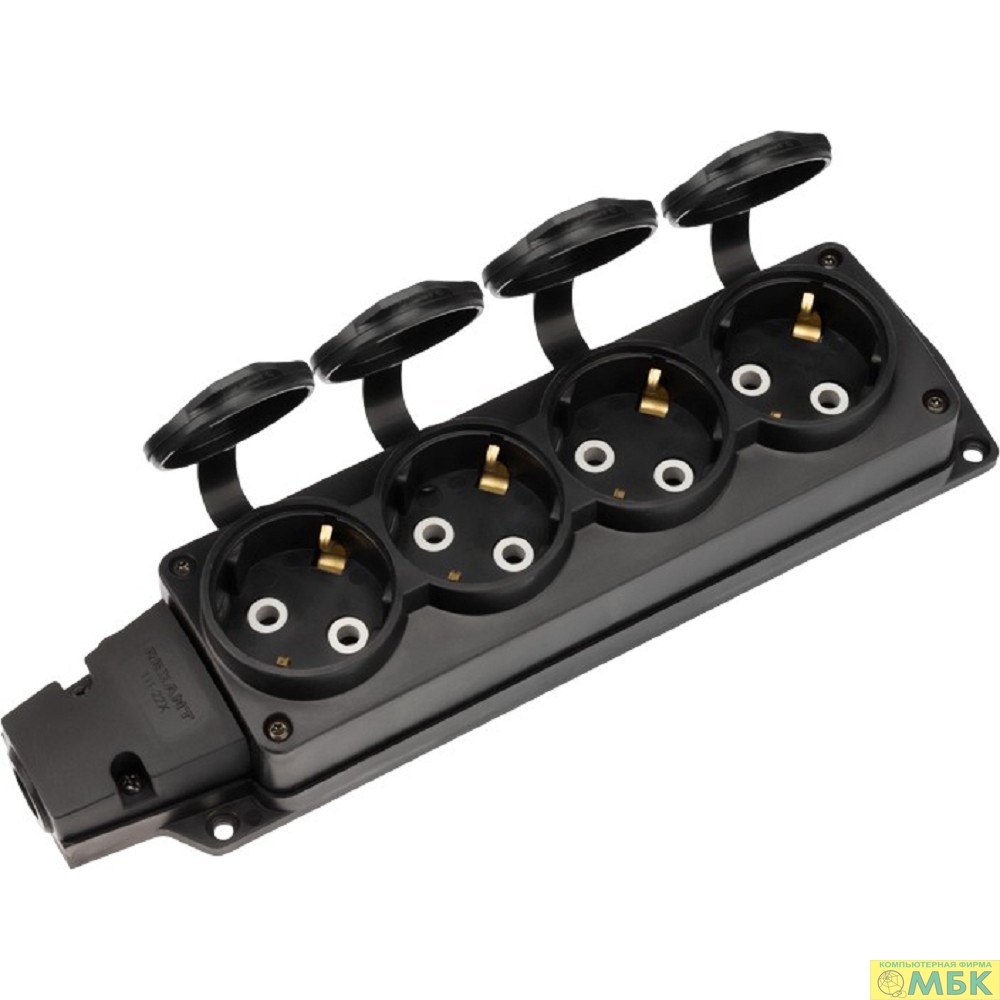 Rexant (111-224) Розетка (колодка) влагозащищенная с крышкой 4 гнезда COMPACT, с/з, 16А, IP54, каучук, черная
