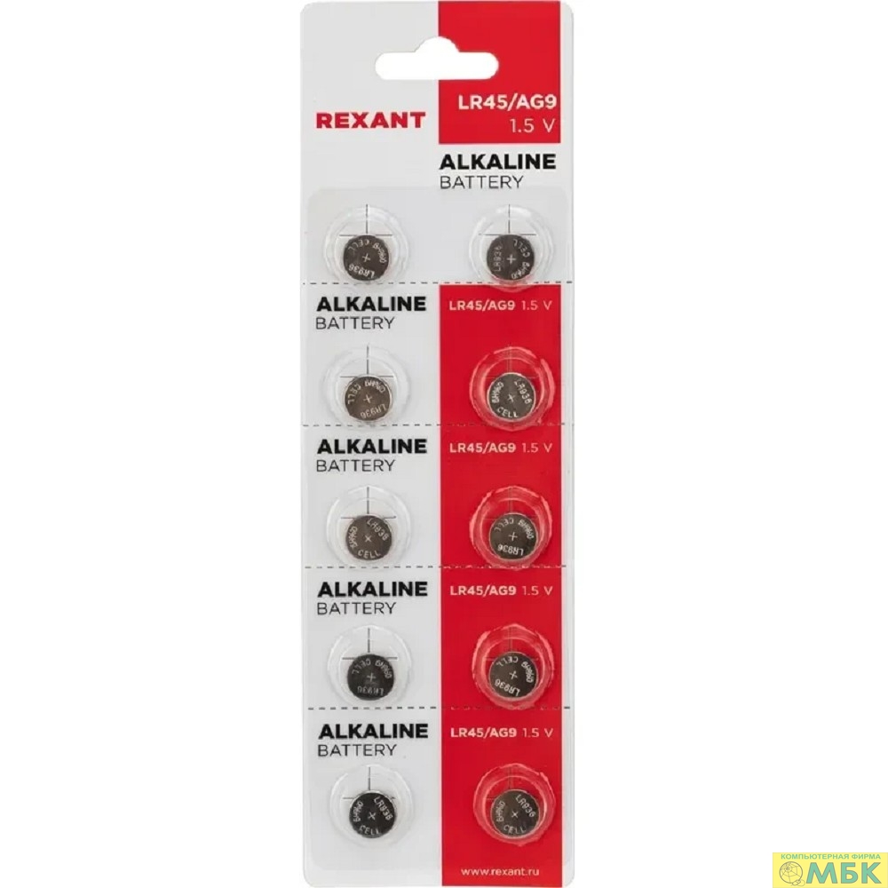 Rexant (30-1032) Батарейка часовая LR45, 1,5В, 10 шт (AG9, LR936, G9, 194, GP94A, 394, SR936W) блистер
