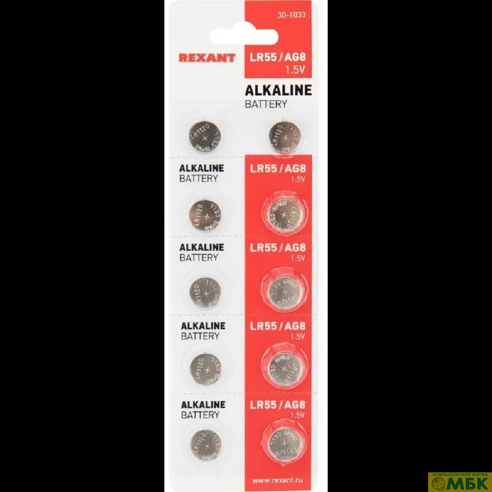 Rexant (30-1033) Батарейка часовая LR55, 1,5В, 10 шт (AG8, LR1120, G8, 191, GP91A, 391, SR1120W) блистер