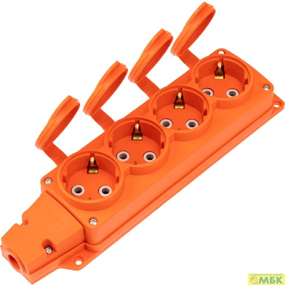 Rexant (111-228) Розетка (колодка) влагозащищенная с крышкой 4 гнезда COMPACT, с/з, 16А, IP54, каучук, оранжевая