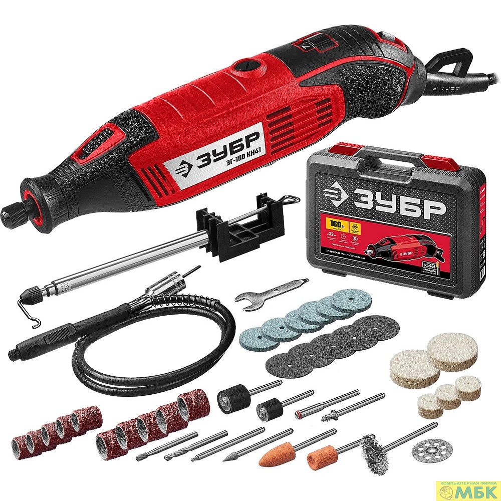 ЗУБР "МАСТЕР" Гравер [ЗГ-160 КН41] {220В, 160 Вт, 3.2 мм, 15000-35000 об/мин, набор насадок, цанг и державок, гибкий вал, штатив, 41 предмет, кейс}