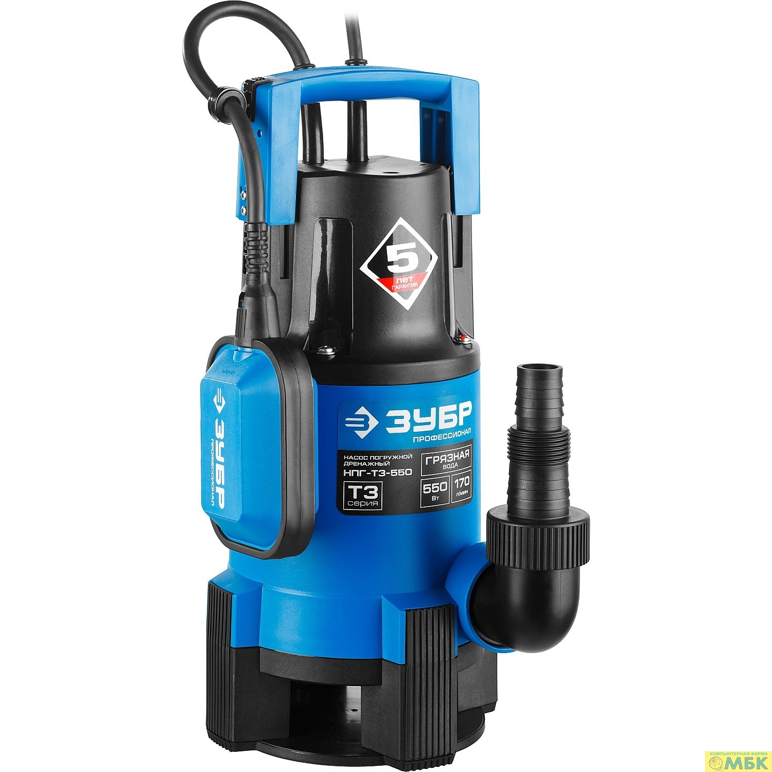ЗУБР Профессионал [НПГ-Т3-550] Насос Т3 погружной { дренаж. для грязной воды (d частиц до 35мм), 550Вт, пропуск способн 170л/мин, напор 7м, провод 10м }