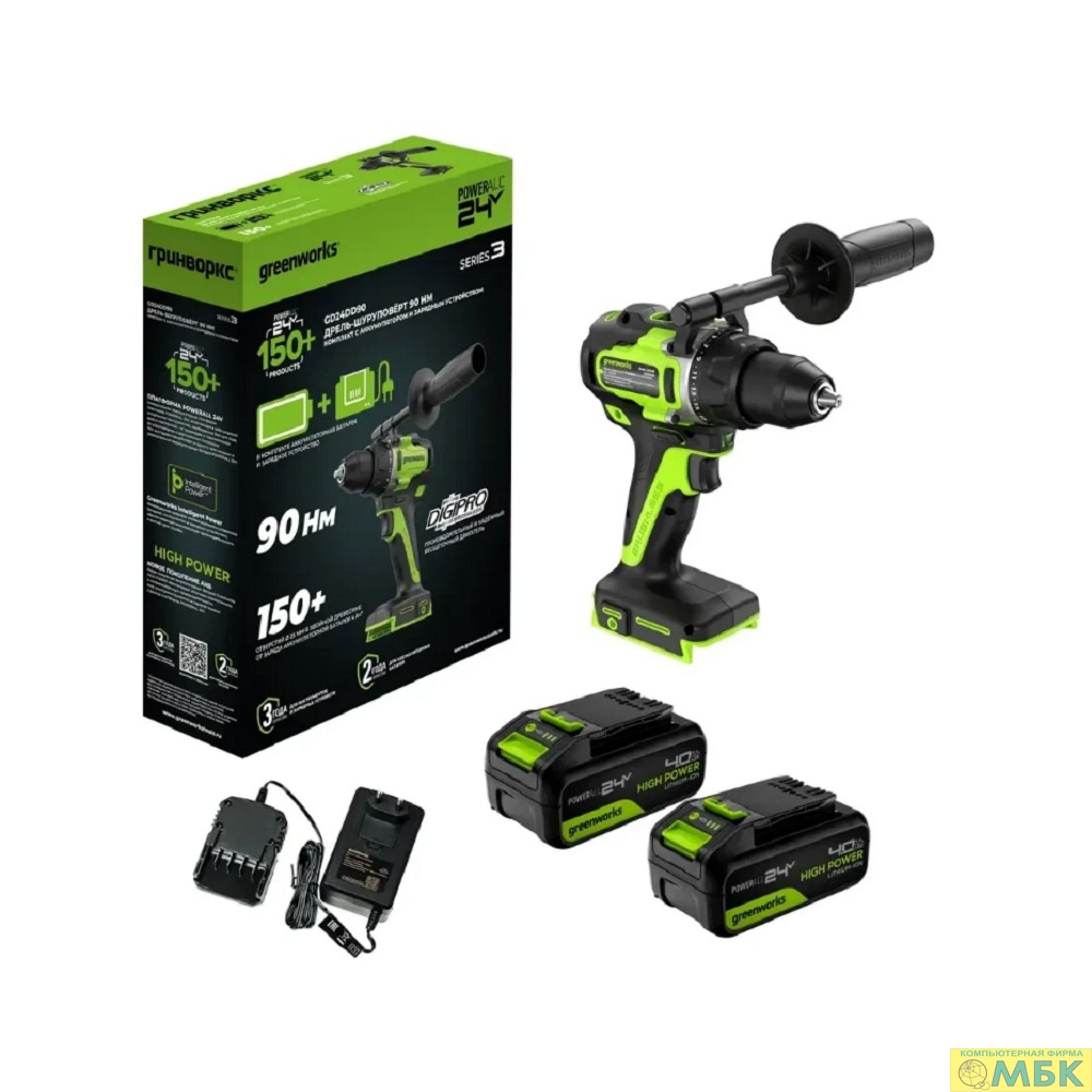 Greenworks GD24DD90 Дрель-шуруповерт аккумуляторная, 24V, 90 Нм, бесщеточная, 45/90Нм,2х4Ач,ЗУ,кор [3707507CUD]