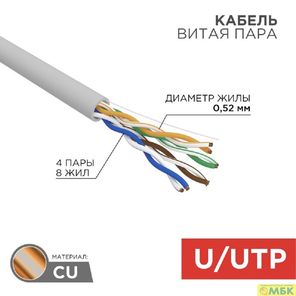 Rexant (02-0004) Кабель витая пара, U/UTP, CAT 5e, ZH нг(А)-HF, 4х2х0,52мм, 24AWG, INDOOR, SOLID, серый, 305м PRO
