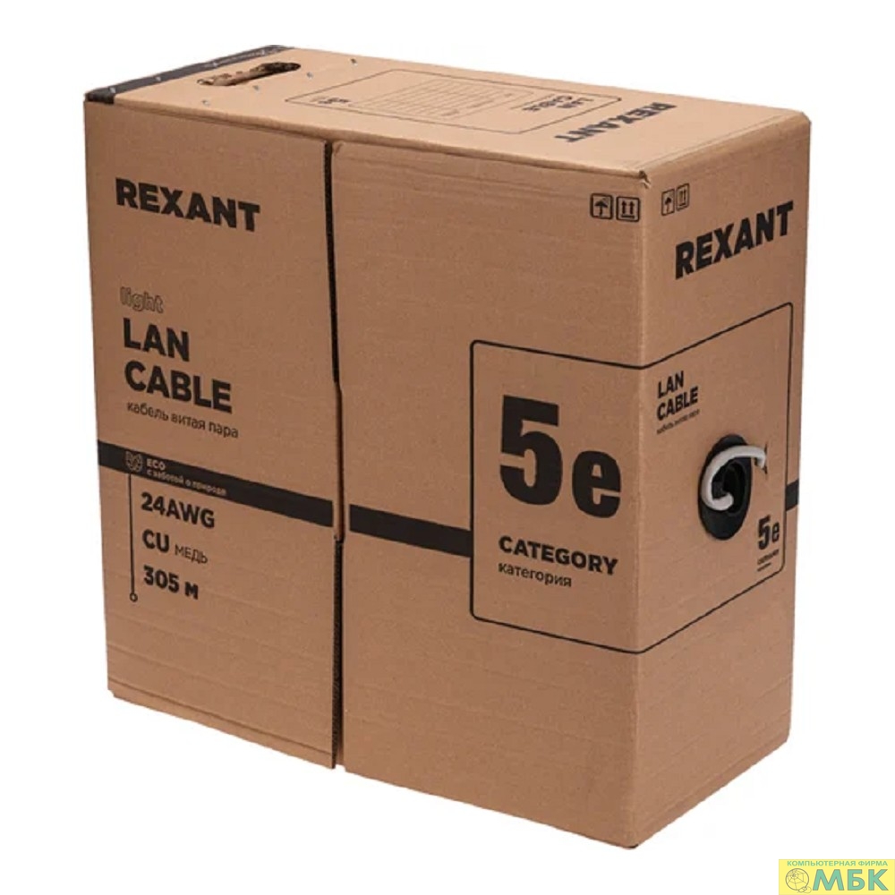 Rexant (02-0005 ) Кабель витая пара U/UTP, CAT 5e, PVC, 4х2х0,52 мм, 24AWG, INDOOR, SOLID, серый, 305 м PRO