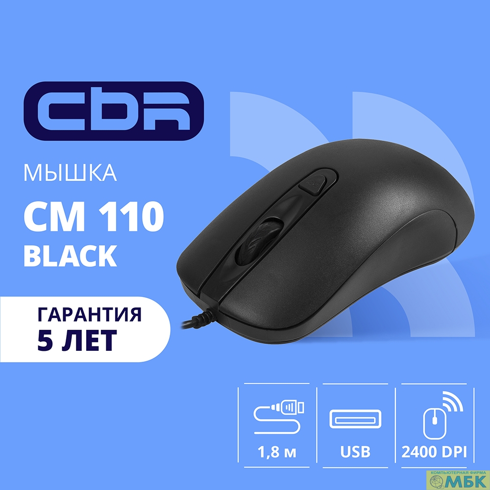 CBR CM 110 Black USB, Мышь офисн., оптич., 800/1200/1600/2400 dpi, 4 кн., 1.8 м, резиновое колесо прокрутки