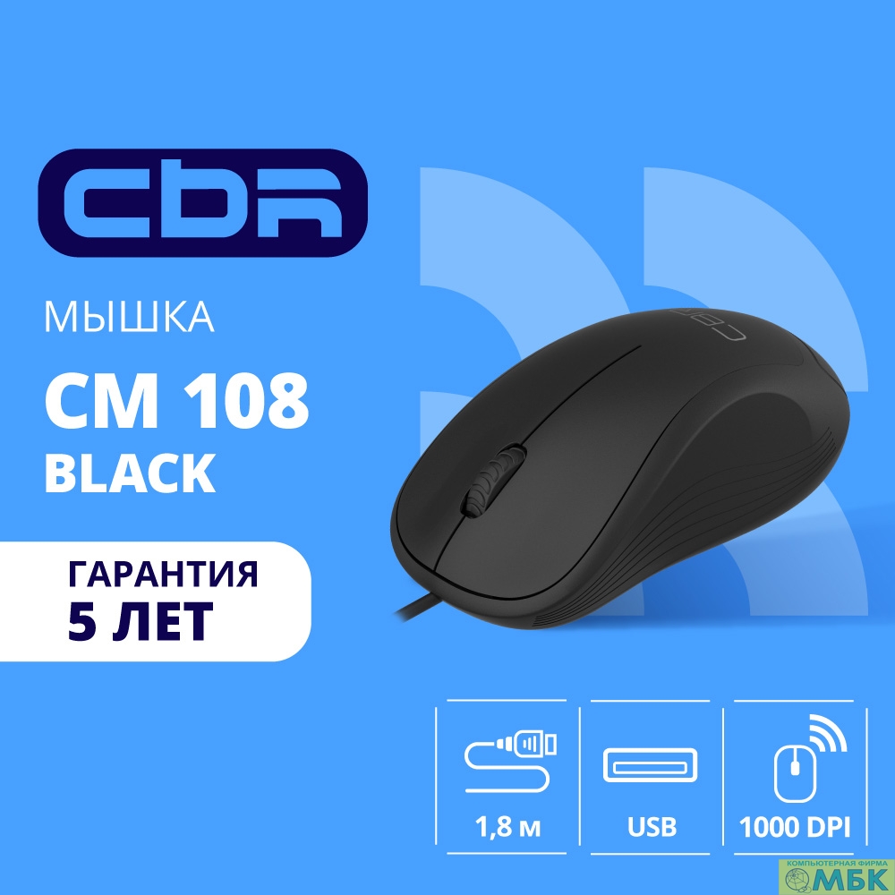 CBR CM 108 Black USB, Мышь офисн., оптич., эргоном., 1000 dpi, 3 кн., 1.8 м, резиновое колесо прокрутки