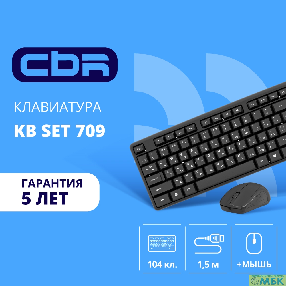 CBR KB SET 709, Комплект (клавиатура + мышь), USB. Клавиатура: 104 кл., офисн., 1,5 м. Мышь: 1000 dpi, 3 кн., 1,5 м