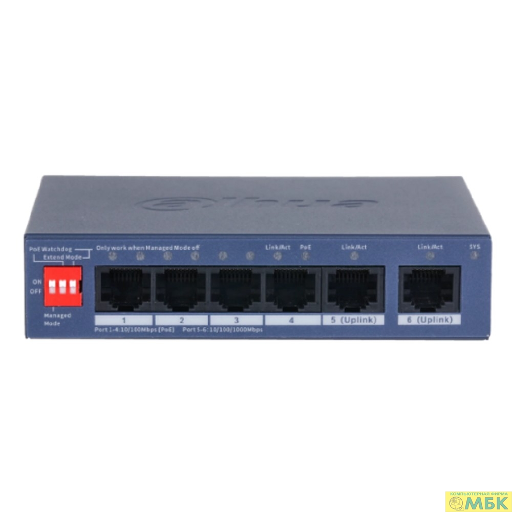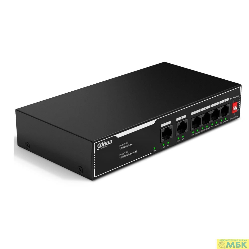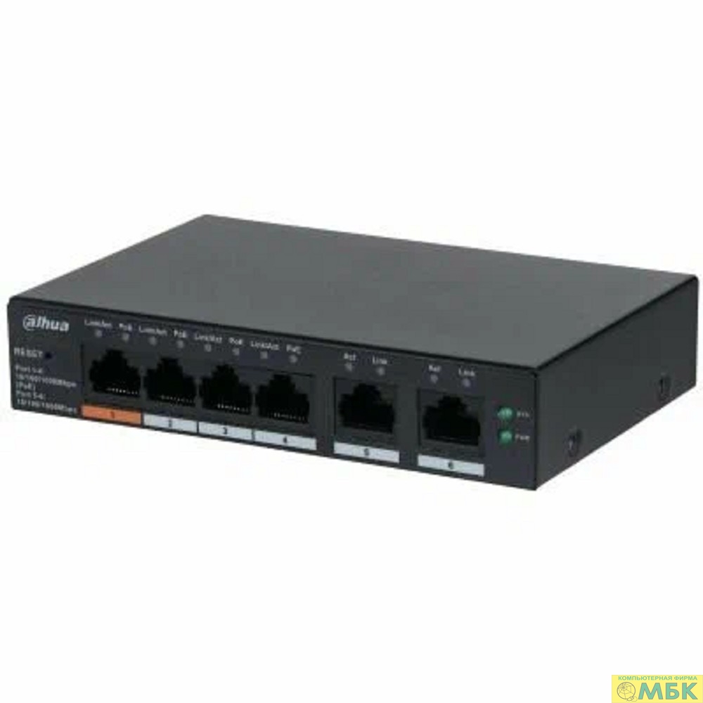 DAHUA DH-SF1006LP 6-портовый неуправляемый коммутатор с РоЕ, 4xRJ45 100Mb PoE, 2xRJ45 100Mb uplink, суммарно 36Вт, коммутация 1.2 Гбит/с, MAC-таблица 2K, металл