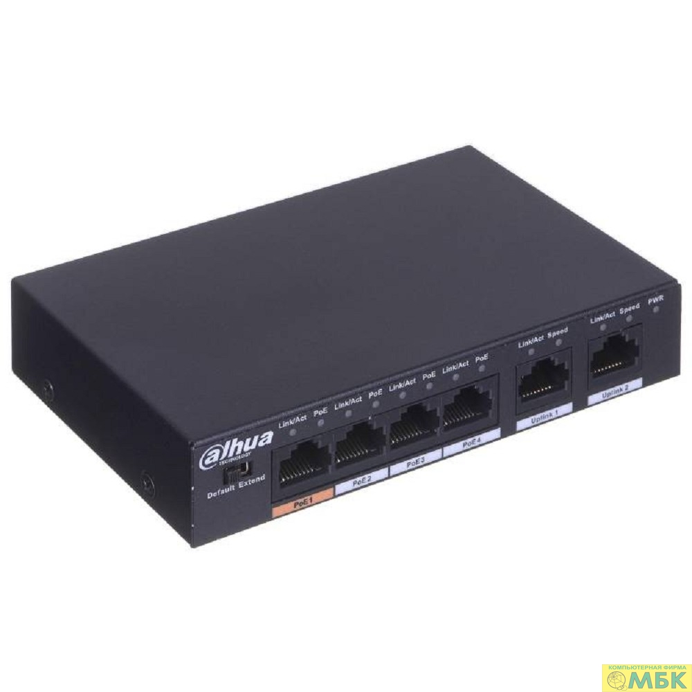 DAHUA DH-PFS3006-4ET-60 4-портовый неуправляемый коммутатор с РоЕ, 4xRJ45 100Mb PoE, 2xRJ45 100Mb uplink, суммарно 60Вт, коммутация 1.8 Гбит/с, MAC-таблица 2К, металл