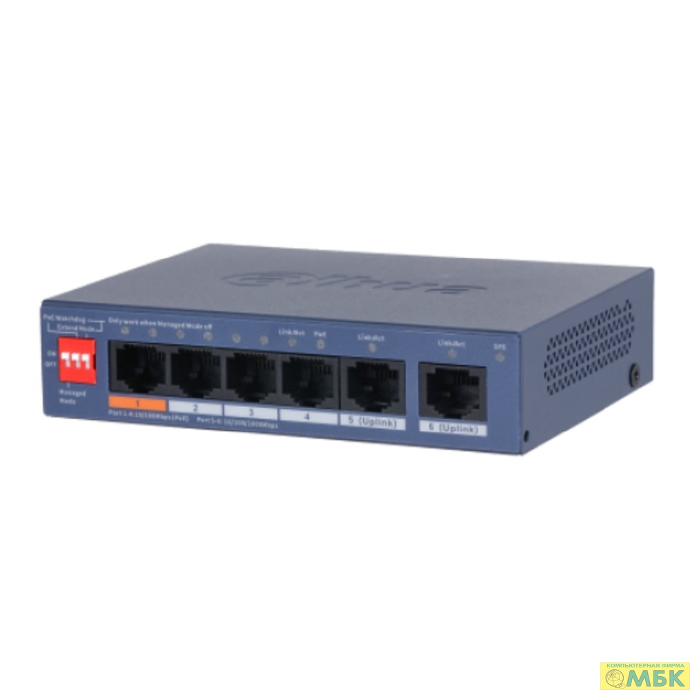 DAHUA DH-CS4006-4ET2GT-60 4-портовый гигабитный PoE коммутатор с функцией облачного управления, 4xRJ45 100Mb, 2xRJ45 1Gb uplink, суммарно 60Вт