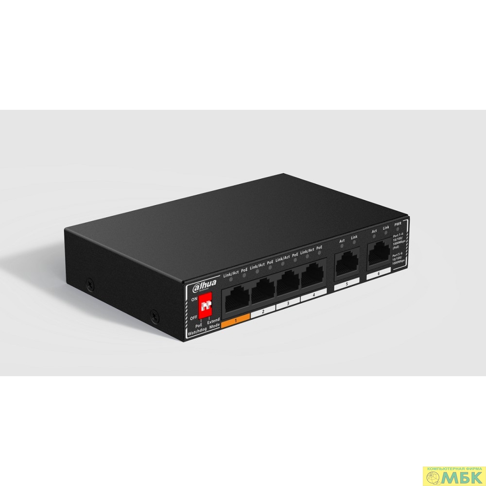DAHUA DH-SG1006P 6-портовый гигабитный неуправляемый коммутатор c PoE, 4xRJ45 1Gb PoE, 2xRJ45 1Gb uplink, суммарно 60Вт, коммутация 14 Гбит/с, MAC-таблица 2K, металл