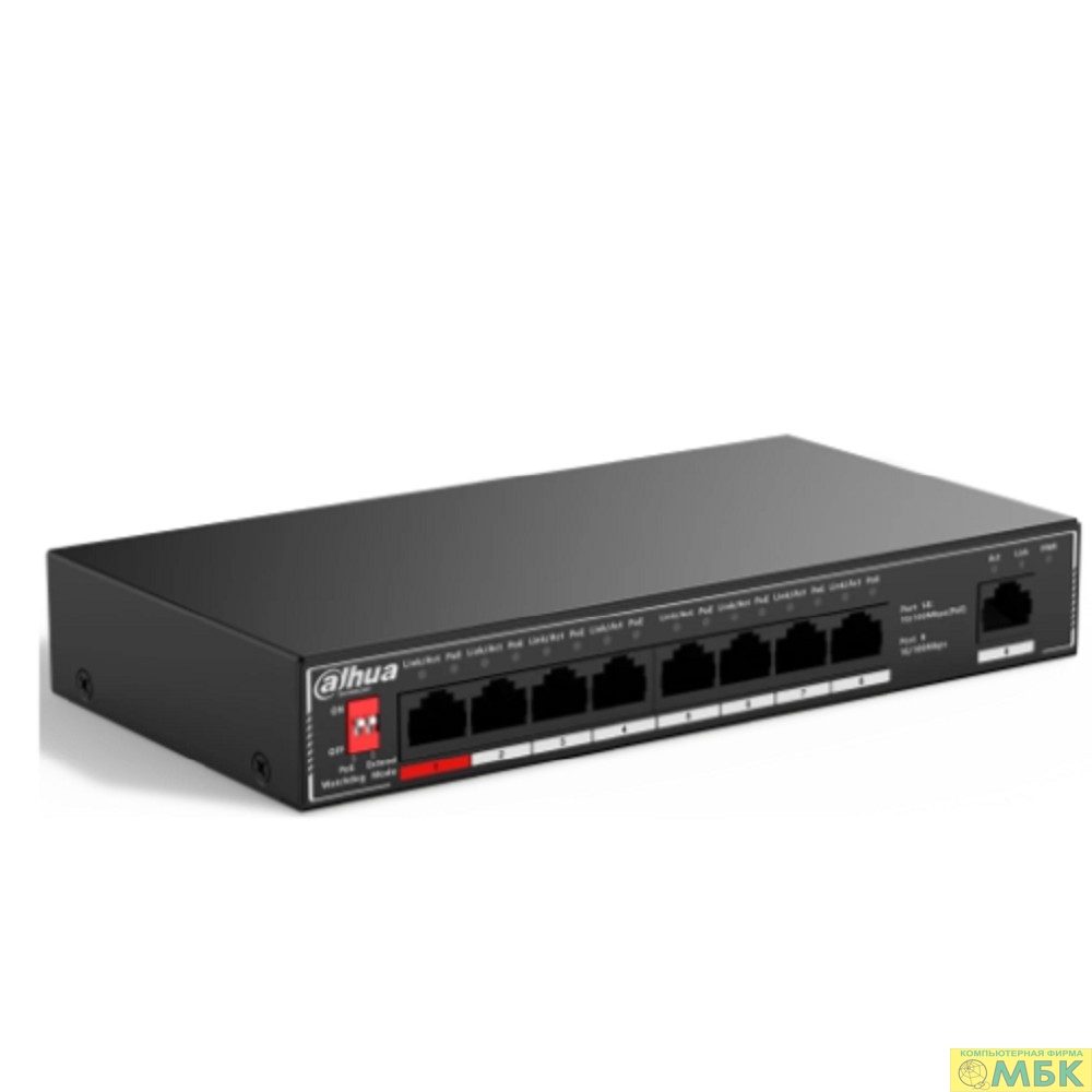 DAHUA DH-SF1009P 9-портовый неуправляемый коммутатор с РоЕ, 8xRJ45 100Mb PoE, 1xRJ45 100Mb uplink, суммарно 96Вт, коммутация 1.8 Гбит/с, MAC-таблица 2K, металл