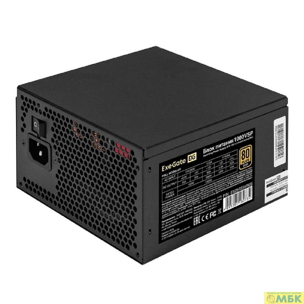 Exegate EX297234RUS Блок питания 1000W ExeGate 80 PLUS® GOLD 1000VSP FC (ATX3.0, APFC, КПД 90% (80 PLUS GOLD), 120mm fan, 24pin, 2x(4+4)pin, PCIE5.0/12VHPWR, 4xPCI-E, 6xSATA, 3xIDE, 1xFDD, Full Cable