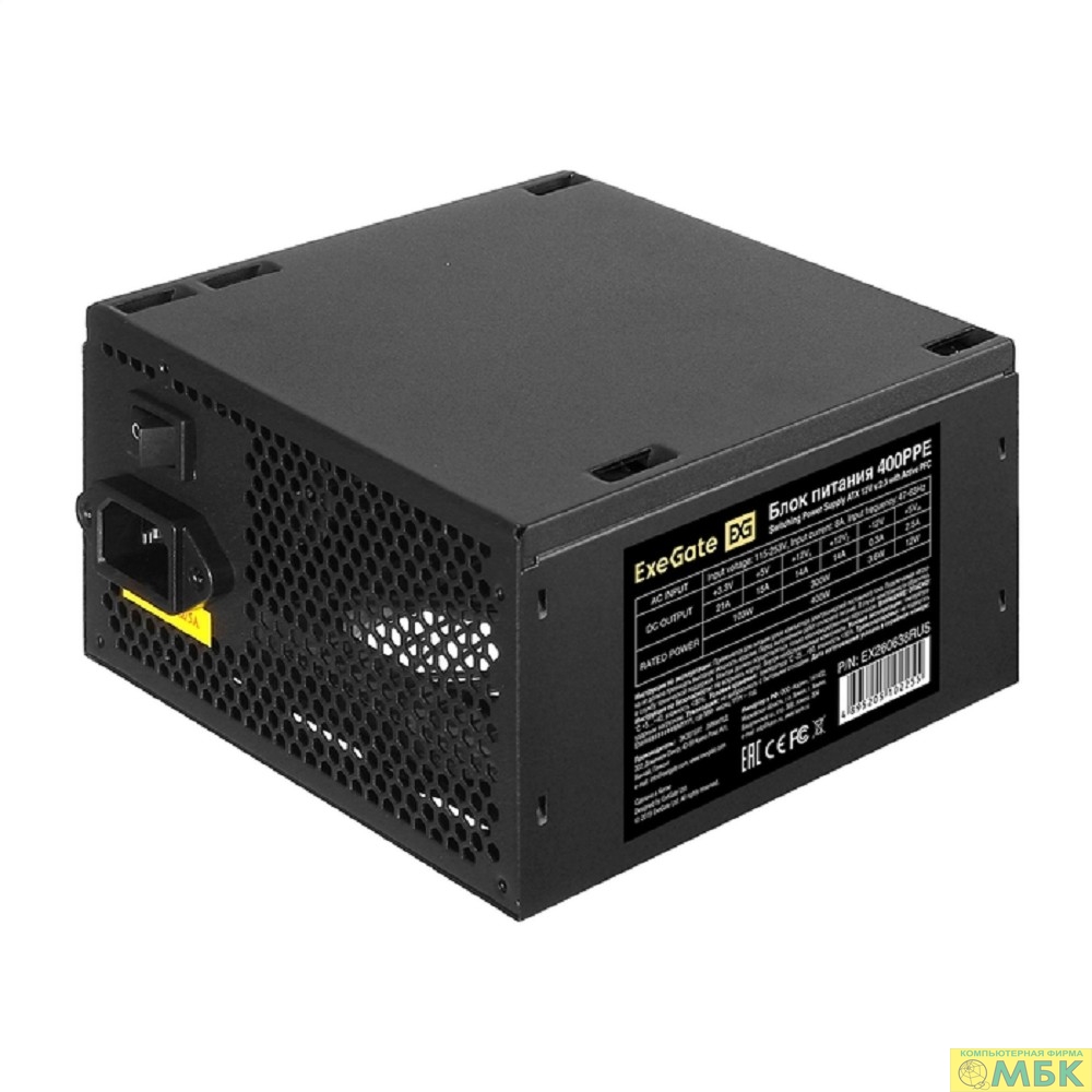 Exegate EX260638RUS-PC Блок питания 400W ExeGate 400PPE (ATX, APFC, PC, КПД 80% (80 PLUS), 12cm fan, 24pin, (4+4)pin, PCIe, 5xSATA, 3xIDE, black, кабель 220V в комплекте)