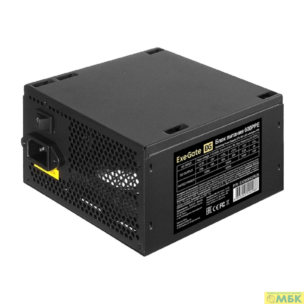 Exegate EX260643RUS-PC Блок питания 600W ExeGate 600PPE (ATX, APFC, PC, КПД 80% (80 PLUS), 12cm fan, 24pin, 2x(4+4)pin, PCIe, 5xSATA, 3xIDE, black, кабель 220V в комплекте)