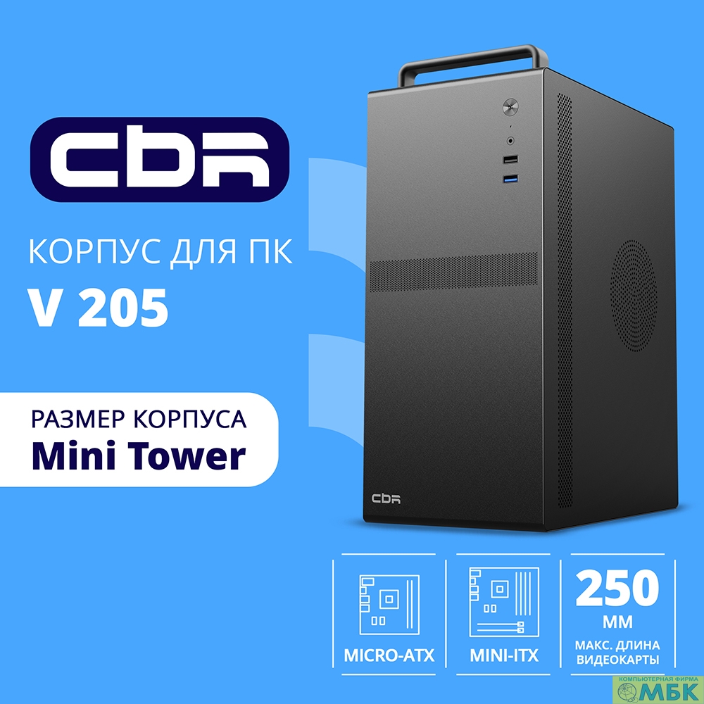 CBR Корпус mATX Minitower V205, без БП, 1*USB 3.0, 1*USB 2.0, HD Audio+Mic, ручка, каркас металл 1.8мм, Black [PCC-MATX-V205-WPSU]