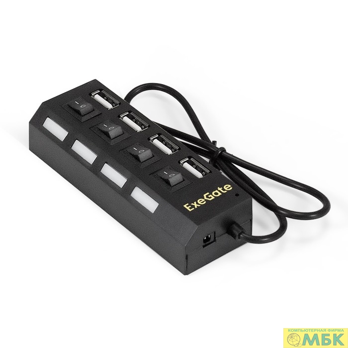 Exegate EX293977RUS USB-Хаб (концентратор) ExeGate DUB-42SW (кабель-адаптер USB2.0 --> 4xUSB2.0, кнопки включения/отключения для каждого порта, Plug&Play, черный)
