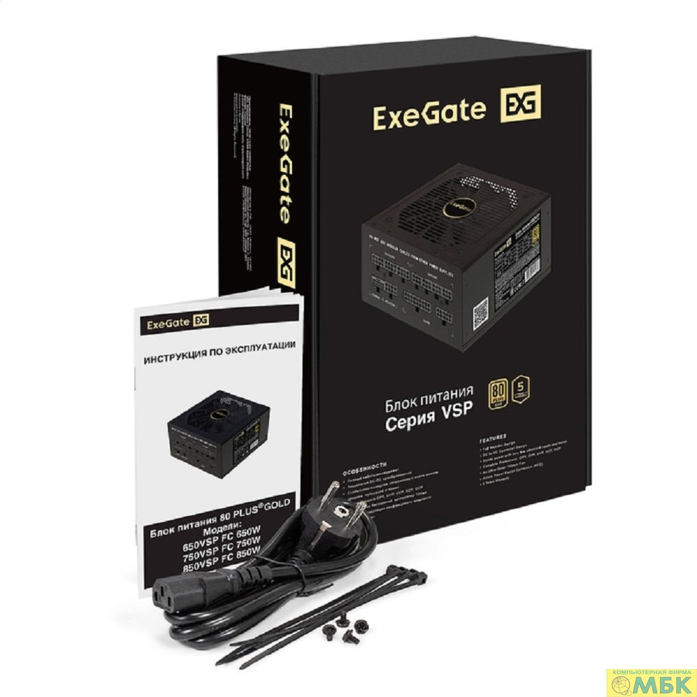 Exegate EX297233RUS Блок питания 850W 80 PLUS® GOLD 850VSP FC (ATX3.0, APFC, КПД 90% (80 PLUS GOLD), 120mm fan, 24pin, 2x(4+4)pin, PCIE5.0/12VHPWR, 4xPCI-E, 6xSATA, 3xIDE, 1xFDD, Full Cable Management