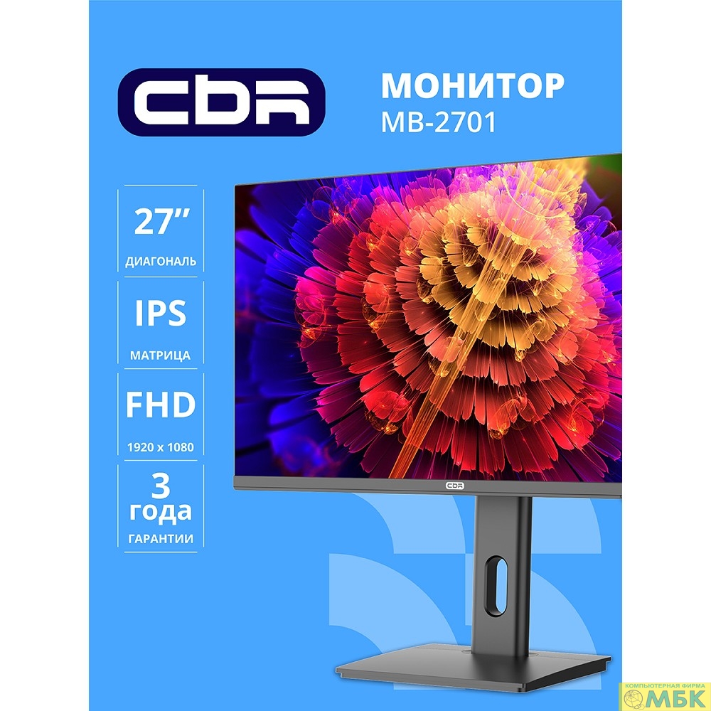 CBR LCD Монитор 27" MB-2701, IPS, FHD 1920x1080, 100Гц, Динамики 2*3W, HAS, Pivot, 1*DP/1*HDMI/1*VGA, внутренний БП, FreeSync, черный, кабель HDMI 1.5м [LCD-MB2701-OPC]