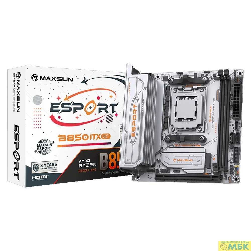 MAXSUN MS-eSport B850ITX WIFI ICE (Socket AM5, mini-ITX, 2*DDR5(96Gb), DP/HDMI, 2*SATA3, 2*M.2, 1*PCIEx16, 4*USB2.0, 2*USB 3.0, 1*Type-C, LAN 1*2,5G, Bluetooth, Wi-Fi 802.11ax, RTL)