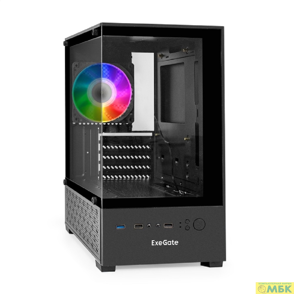 Exegate EX298221RUS Корпус Minitower ExeGate i3 SEA (mATX, без БП, 1*USB+1*USB3.0, HD аудио, черный, 1 вент. 12см с RGB подсветкой, передняя и боковая панели - закаленное стекло)