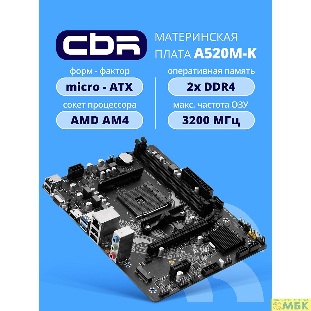 Материнская плата CBR A520M-K {Socket AM4, 2*DDR4, mATX, VGA+HDMI, 1*PCIEx16/1*PCIEx1/1*M.2(NVME & SATA), 4*SATA3, 4*USB2+2*USB3, Glan}