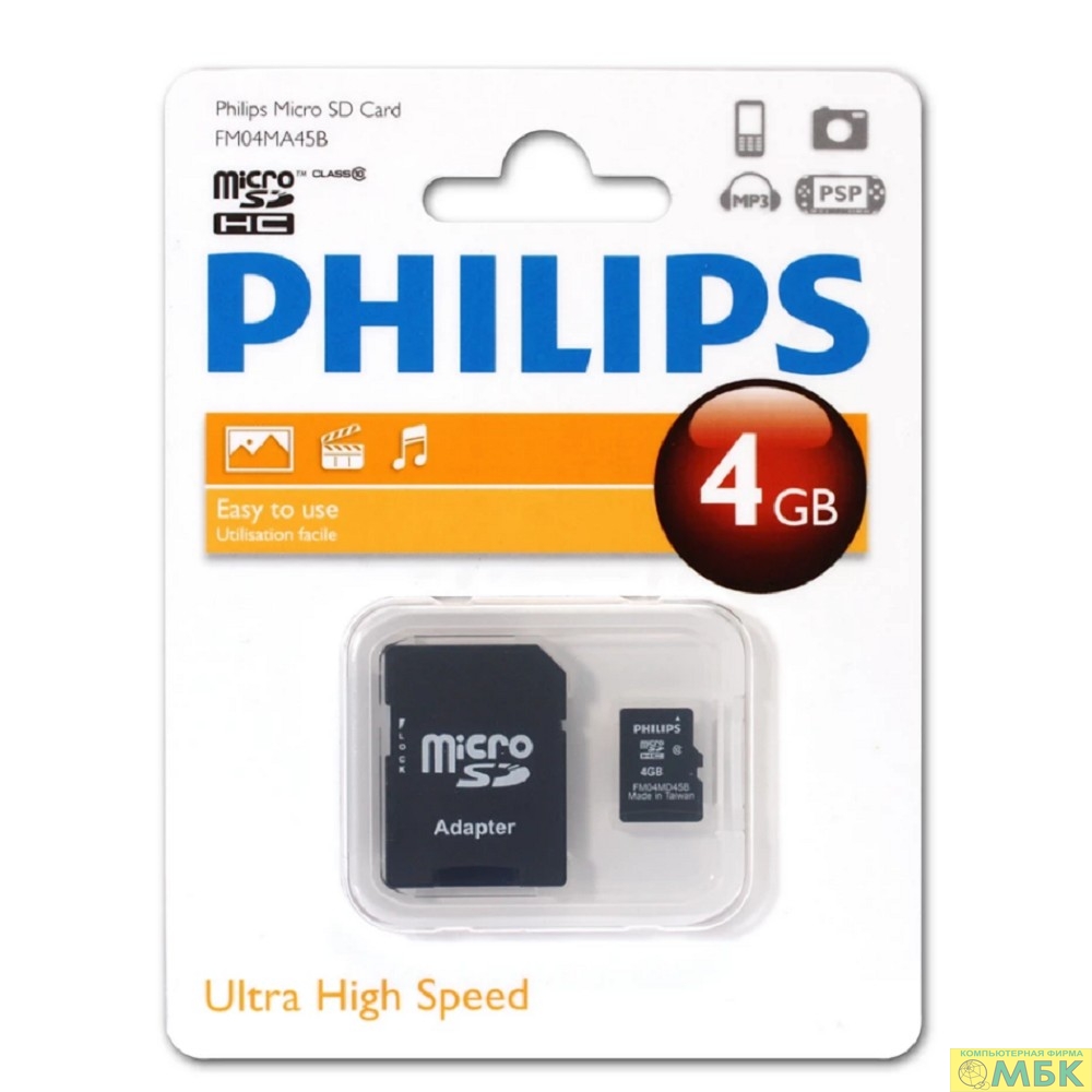 Micro SecureDigital 4GB Philips microSDHC Class 10 (SD адаптер)