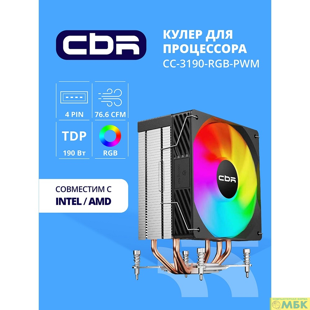 CBR-CC-3190-RGB-PWM Кулер для процессора, Al+Cu, 3 heat pipes, Socket 775/1366/1155/1156/1150/1151/1200/1700/AM2/АМ2+/АМ3/AM3+/FM1/FM2/AM4/AM5, TDP 190W, 120mm Fan, 2300RPM, HB, RGB, PWM, 36db