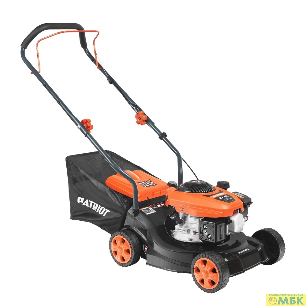 PATRIOT PT 41LM Газонокосилка бензиновая [512109002] {Рабочий объем 123сс, мощность 3.5л.с., раб шир 42см, регул. высоты 30-75мм прорезин. колеса 152-178мм, травосбор. 40л, функц. мульчир.}