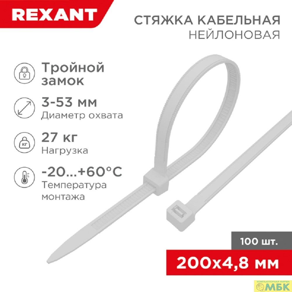 Rexant (67-0200-5) Стяжка нейлоновая Профессиональная 200x4,8мм, белая (100 шт/уп)