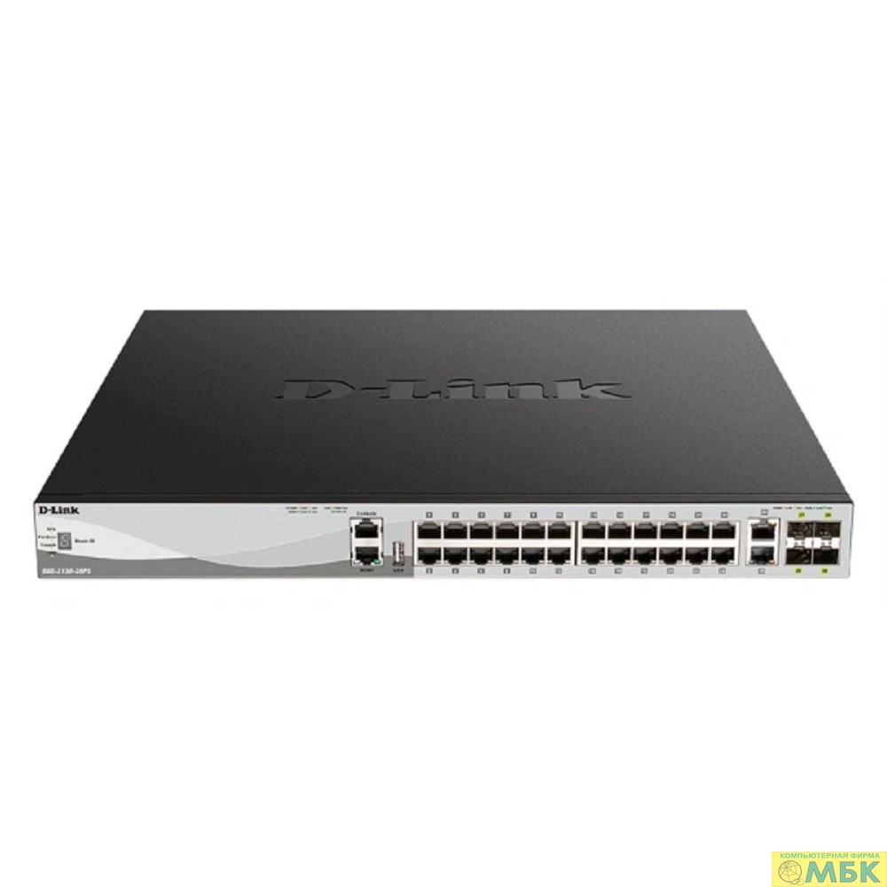 D-Link DGS-3130-30PS/B2A PROJ Управляемый L3 стекируемый коммутатор с 24 портами 10/100/1000Base-T, 2 портами 10GBase-T и 4 портами 10GBase-X SFP+ (24 порта PoE 802.3af/at, PoE-бюджет 370 Вт)