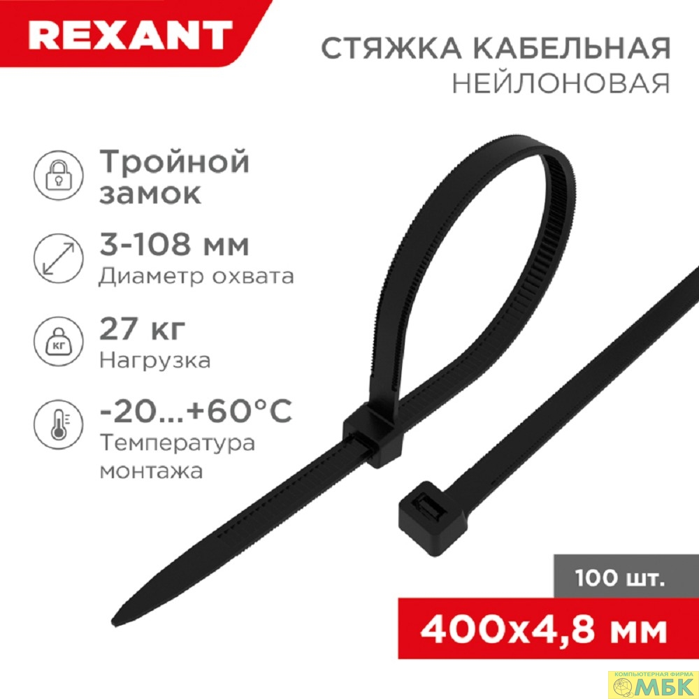 Rexant (67-0401) Стяжка нейлоновая Профессиональная 400x4,8мм, черная (100 шт/уп)
