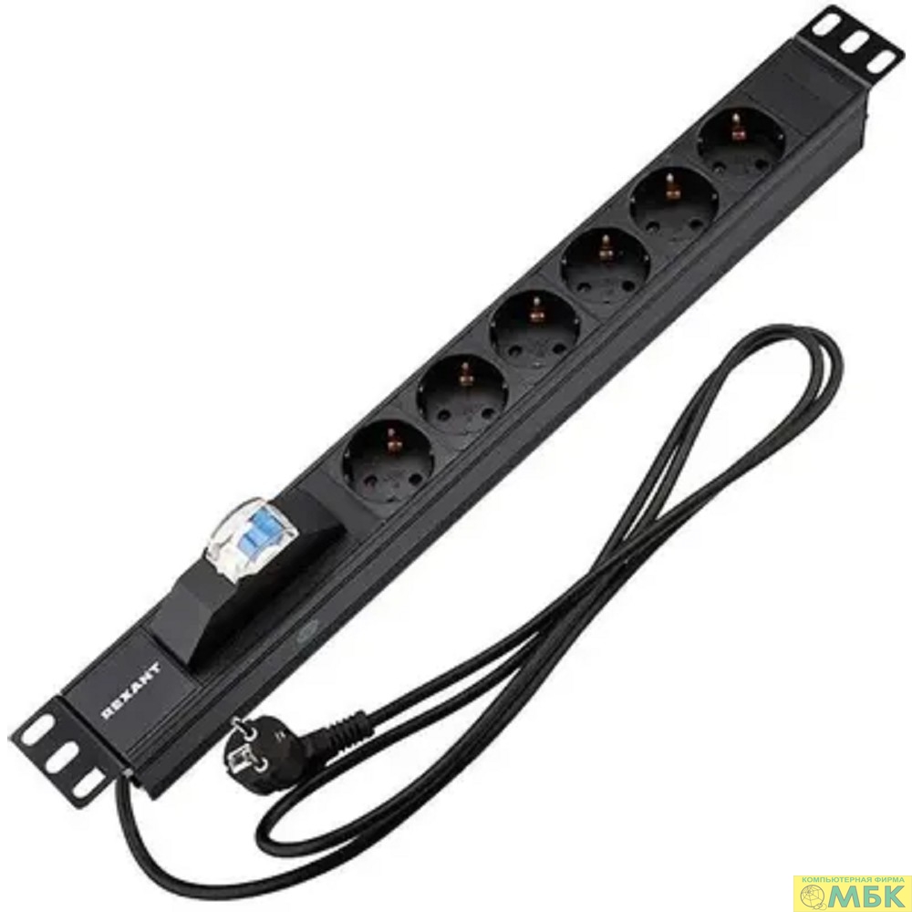 Rexant (04-0103-1) Блок распределения питания для 19" шкафов, горизонтальный, 6 розеток СЕЕ 7/4, 16A, автомат защиты, алюм корп, шнур 2м, вилка СЕЕ 7/7