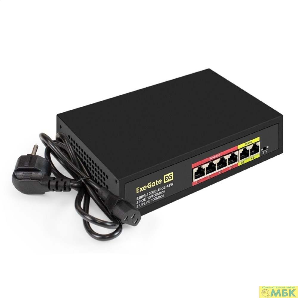 Exegate EX299020RUS Коммутатор неуправляемый ExeGate EDES-1006D.4PoE-48W (6-портовый UTP 10/100 Base-Tx: 4 порта 802.3af (PoE), мощность PoE: 25W, суммарно 48W, 2 порта RJ45 uplink, настенный/настольн