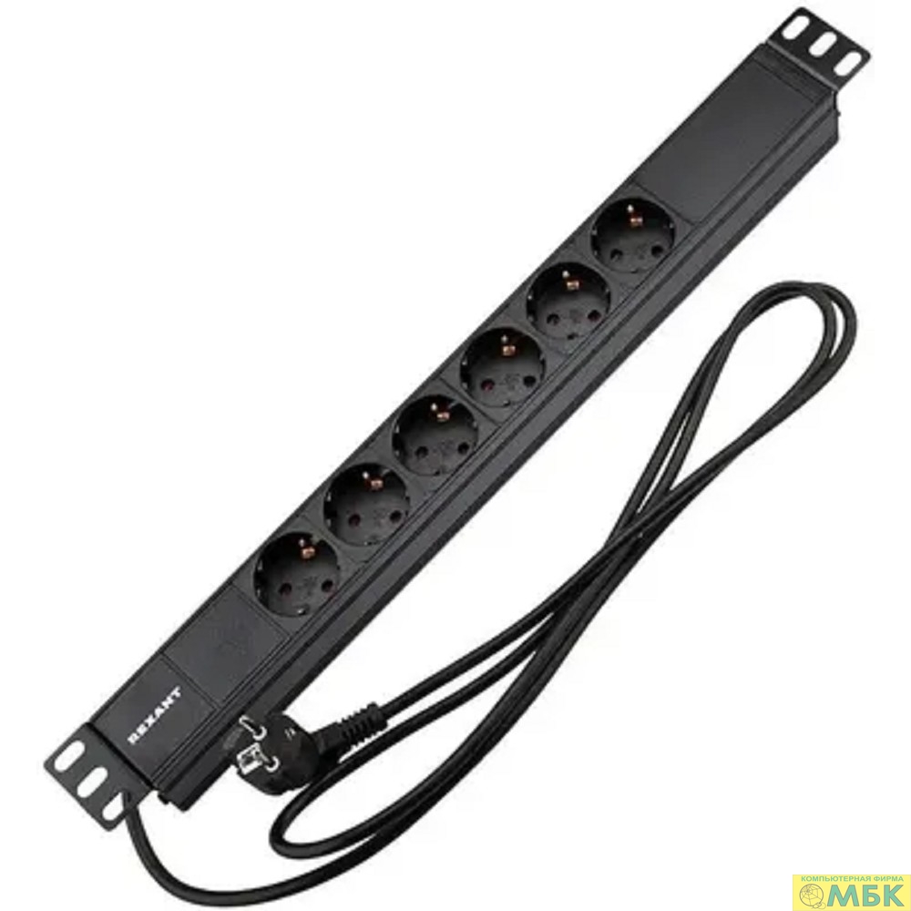 Rexant (04-0101-1) Блок распределения питания для 19" шкафов, горизонтальный, 6 розеток СЕЕ 7/4, 16A, без выкл, алюм корп, шнур 2м, вилка СЕЕ 7/7