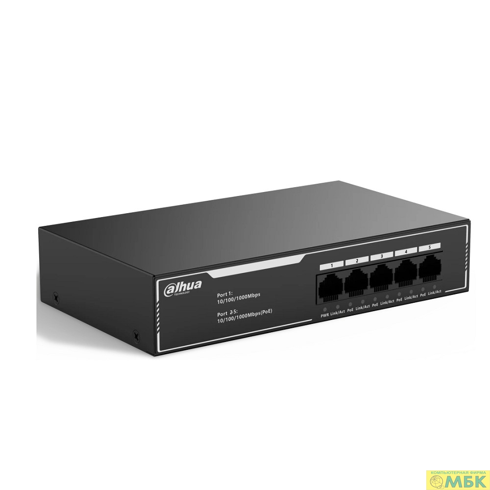 DAHUA DH-SG1005LP 5-портовый гигабитный неуправляемый коммутатор c PoE, 4xRJ45 1Gb PoE, 1xRJ45 1Gb uplink, суммарно 36Вт, коммутация 10 Гбит/с, MAC-таблица 2K, металл