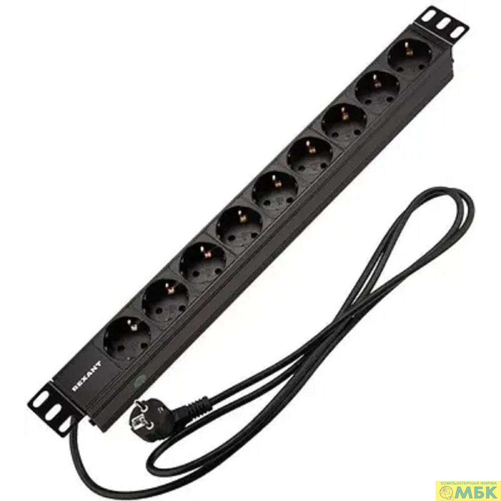 Rexant (04-0105-1) Блок распределения питания для 19" шкафов, горизонтальный, 9 розеток СЕЕ 7/4, 16A, без выкл, алюм корп, шнур 2м, вилка СЕЕ 7/7