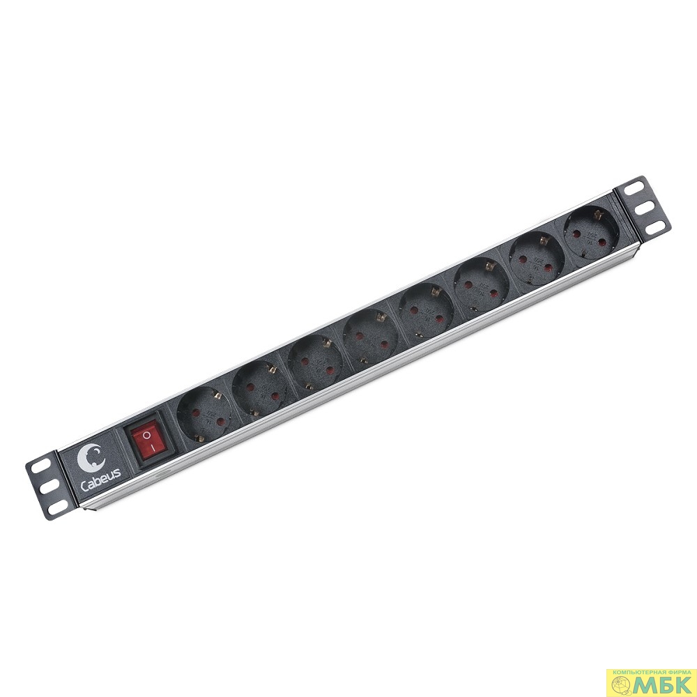 Cabeus PDU-8P Блок евророзеток для 19" шкафов, горизонтальный, 8 розеток, 10 A, выключатель, гнездо под шнур, алюминиевый корпус