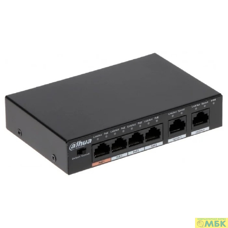 DAHUA DH-CS4006-4ET-60 4-портовый PoE коммутатор с функцией облачного управления, 4xRJ45 100Mb, 2xRJ45 100Mb uplink, суммарно 60Вт, коммутация 4.8 Гбит/с, MAC-таблица 8К