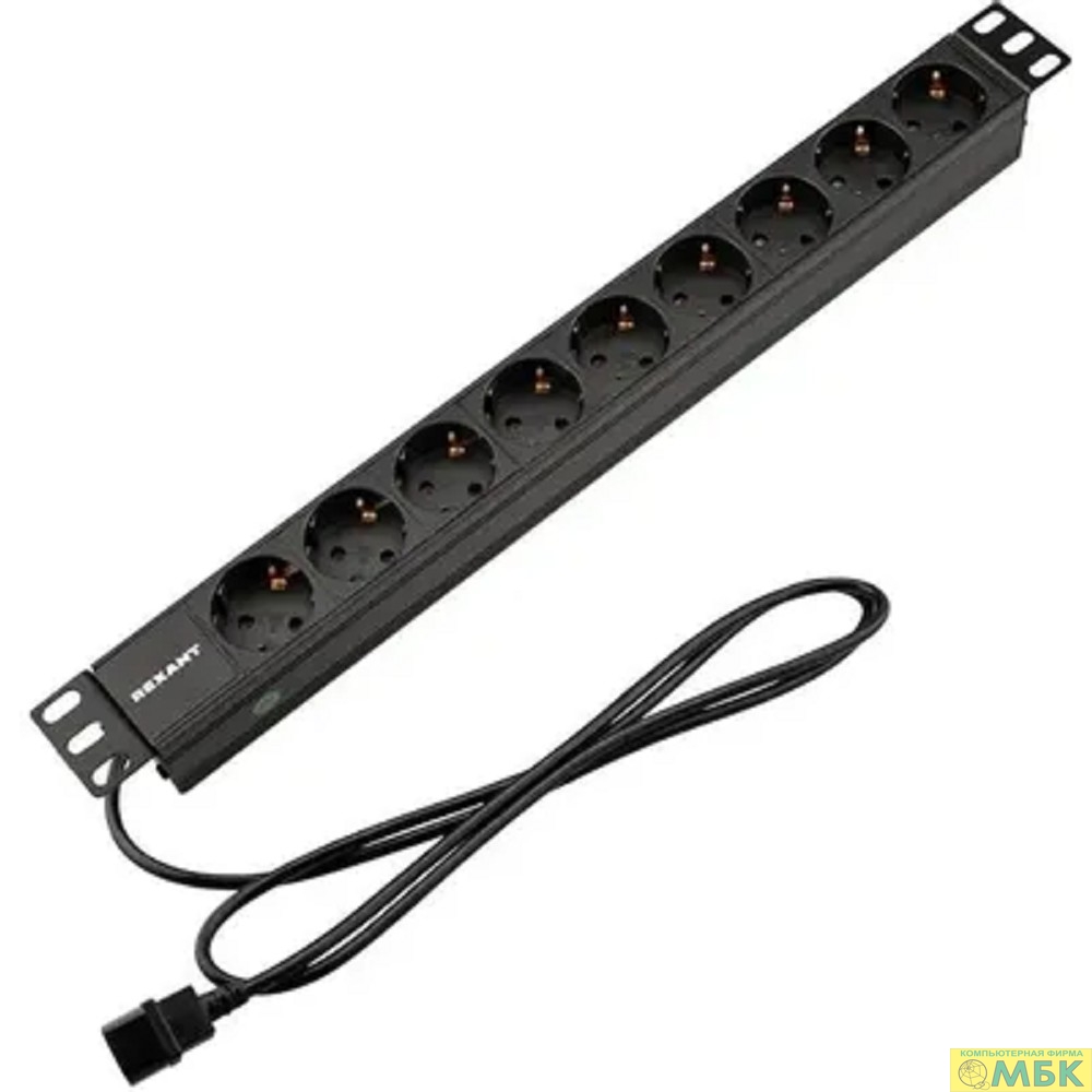 Rexant (04-0305-1) Блок распределения питания для 19" шкафов, горизонтальный, 9 розеток СЕЕ 7/4, 10A, без выкл, алюм корп, шнур 2м, вилка C14
