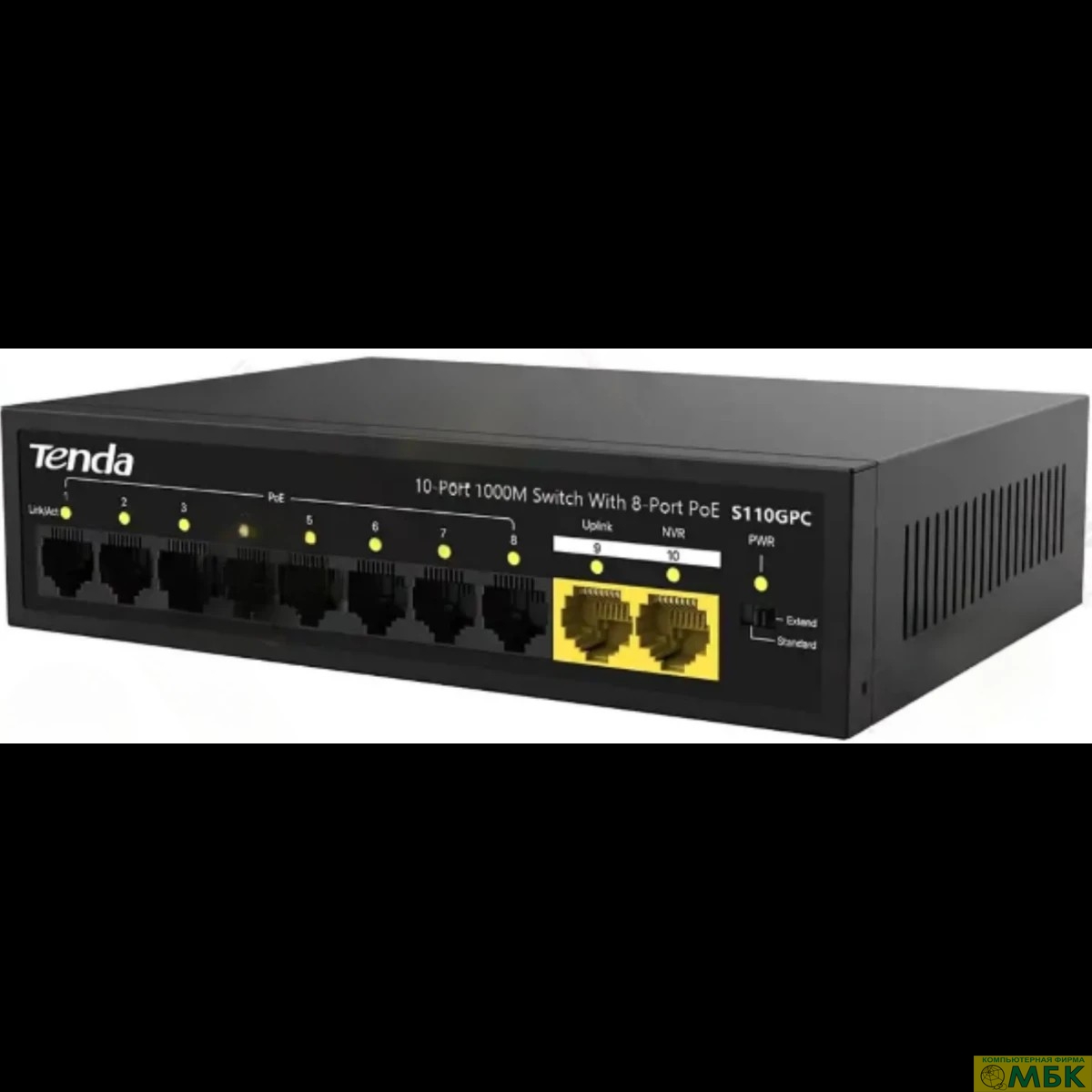 TENDA S110GPC Коммутатор неуправляемый PoE, 10 портов, 8x100 Мбит/с, 2х1 Гбит/с, PoE 8х30 Вт (до 80 Вт), настольный, металлический